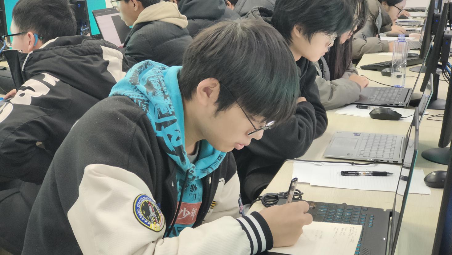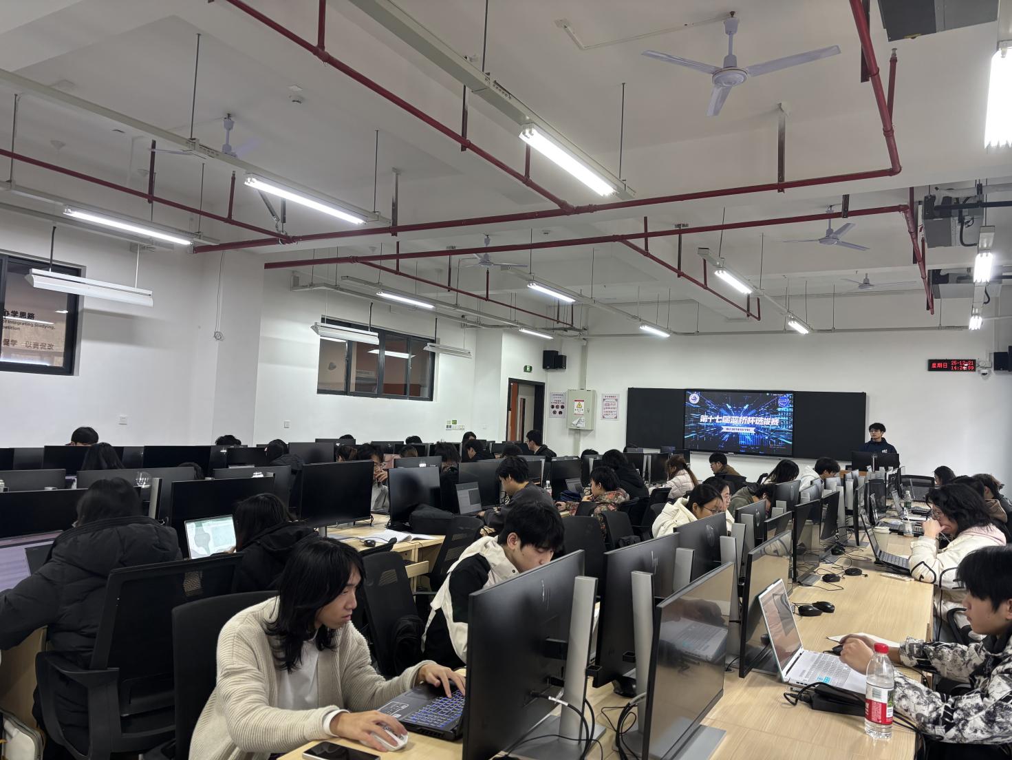 比赛当日,两大校区的竞赛场地秩序井然,选手们精神饱满、专注投入。在激烈角逐中,学子们端坐电脑前,指尖在键盘上飞速跳跃,屏幕上代码不断滚动,时而凝神思考破解难题,时而蹙眉梳理逻辑漏洞,时而会心一笑攻克瓶颈。他们充分运用课堂所学的计算机专业知识,结合竞赛训练积累的解题技巧,灵活应对各类题型挑战,展现出扎实的编程功底与良好的抗压能力。赛场外,由教师代表、ACM集训队骨干组成的裁判团队严格遵守竞赛规则,全程坚守岗位,认真履行监考与评审职责,确保赛事的公平、公正、公开;志愿者团队则全力做好后勤保障与服务工作,为选手们提供及时的技术支持与物资保障,为赛事的顺利推进保驾护航。