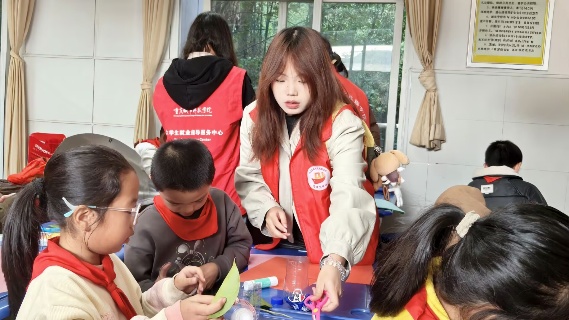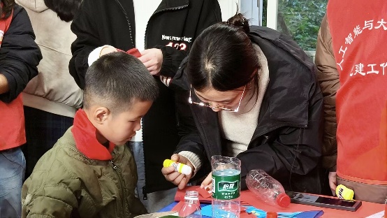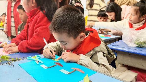 在手工制作环节,志愿者与同学们们结对成组,利用预先收集的塑料瓶、泡沫以及从周边采集的落叶、枯枝等自然材料,共同赋予废弃物品新的生命。同学们在志愿者的引导下,全神贯注地裁剪、拼接、粘贴,普通的材料在他们手中逐渐蜕变为鲜花、金鱼、童话小屋等一个个栩栩如生的“自然精灵”。专注的创作与成功的欢笑声交织在一起,不仅让孩子们亲身体验到“变废为宝”的乐趣,更在他们心中深植绿色发展的理念。