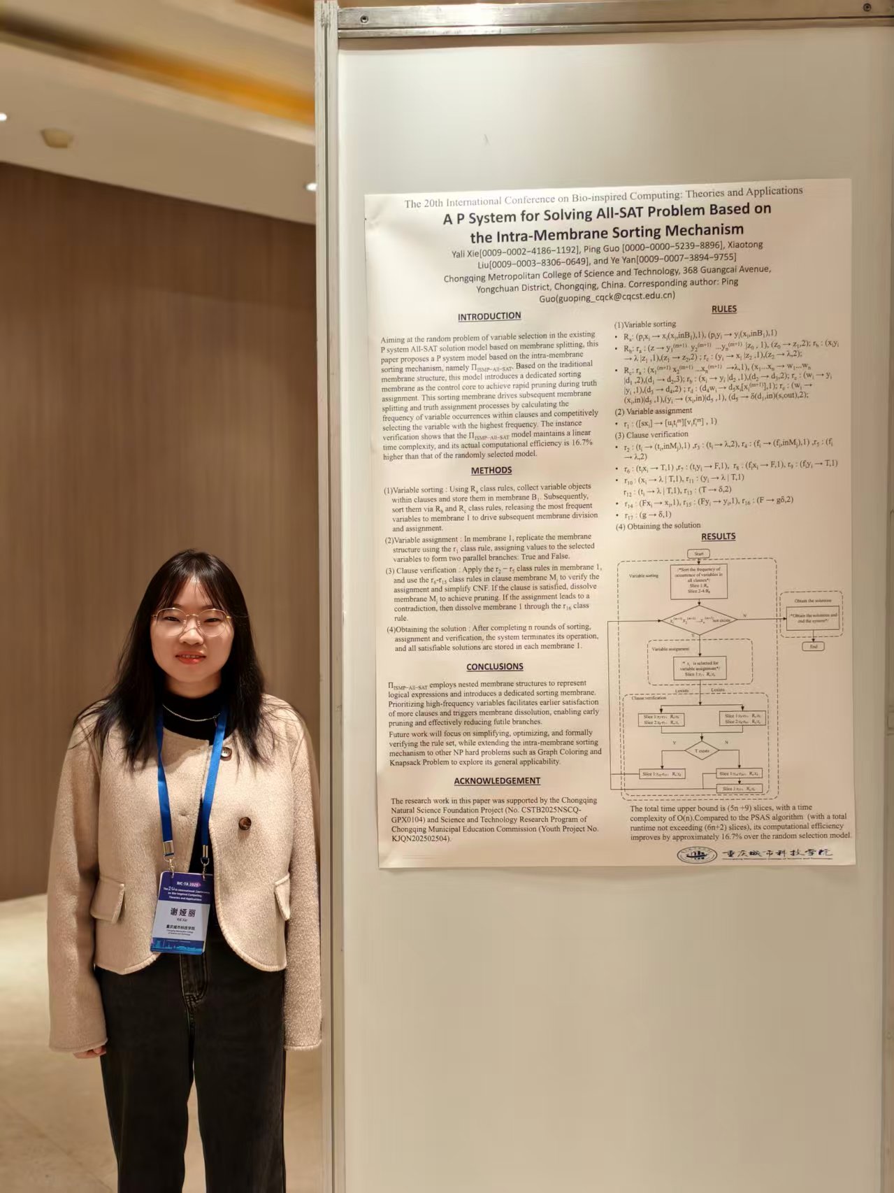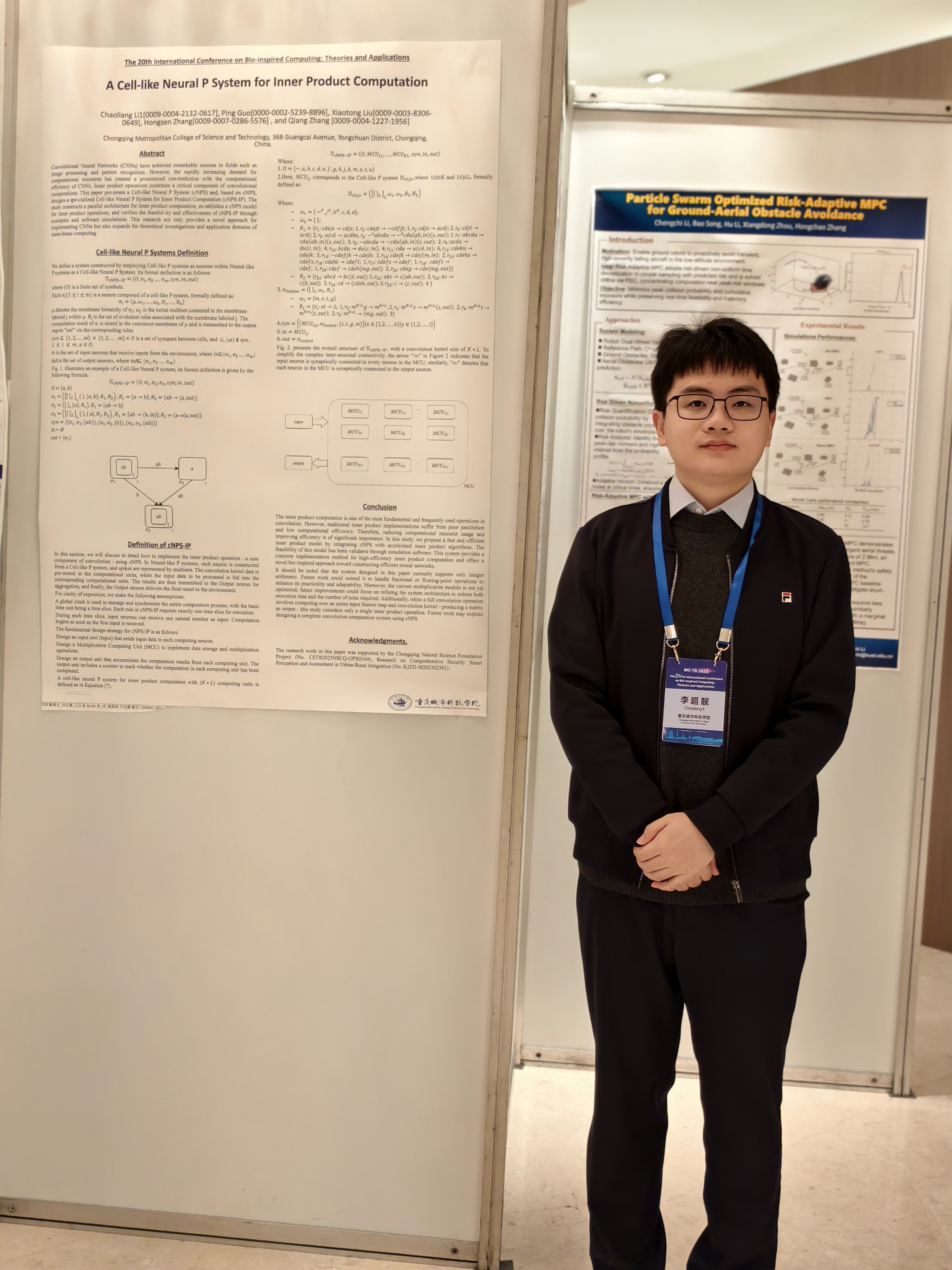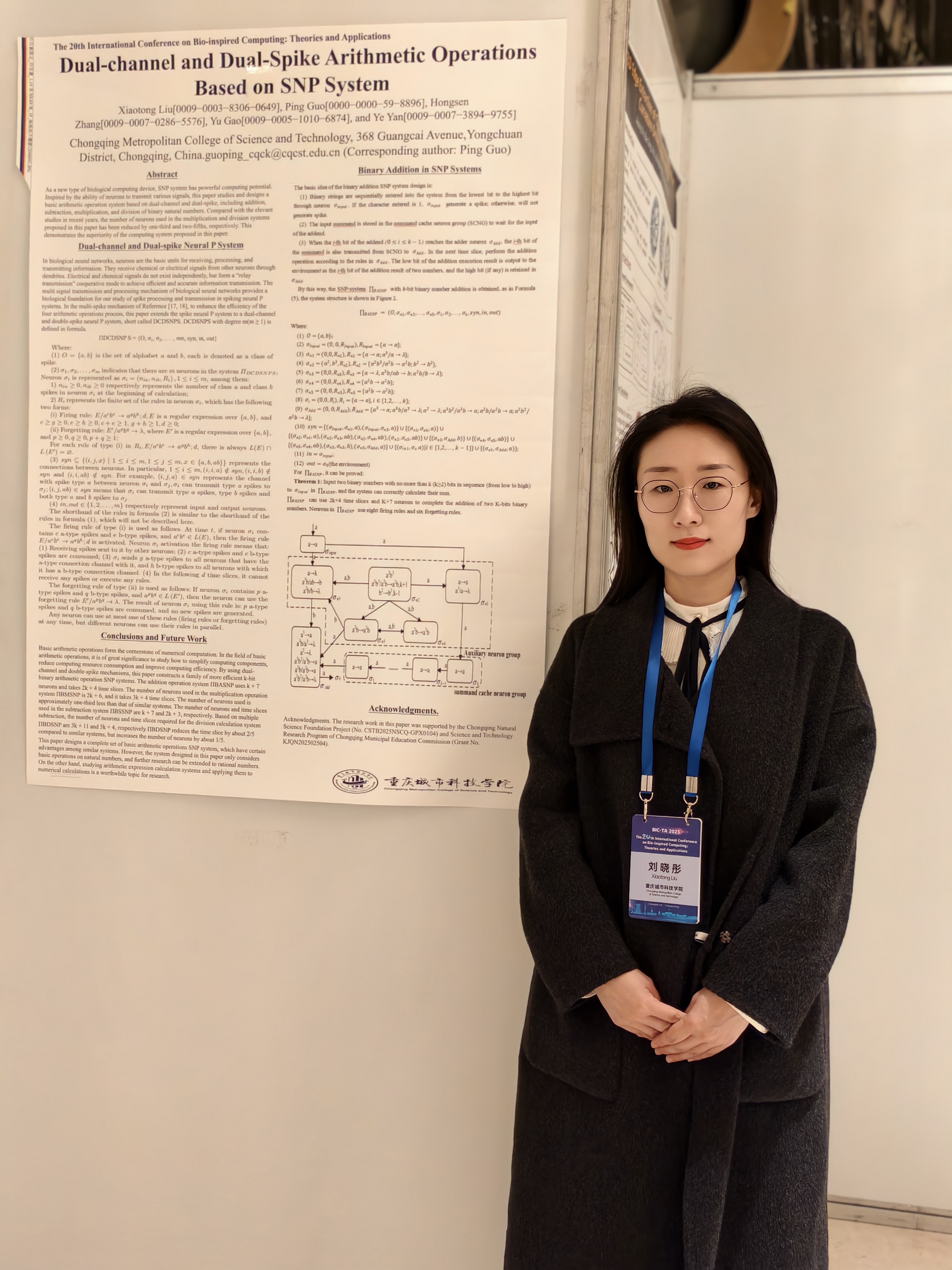 团队在现场以海报的形式展示了最新研究成果,并与其他学者展开交流。包括《A Cel-like Neural P System for Inner Product Computation》、《Dual-channel and Dual-Spike Arithmetic Operations Based on SNP System》、《A P System for Solving All-SAT Problem Based on the Intra-Membrane Sorting Mechanism》3篇论文,研究内容涵盖了类细胞神经P系统内积运算,多通道多脉冲神经P系统算术运算,利用P系统解决ALL-SAT问题。这些研究通过P系统的高并行性特点,相较于传统方法极大地提高了计算效率,为后续实际工程中的使用奠定了理论基础。