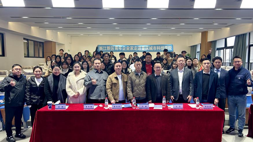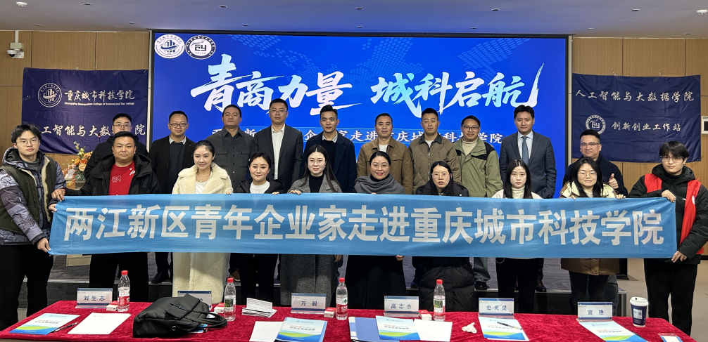 12月26日14:30,“青商力量·城科启航”校企交流活动在重庆城市科技学院巴南校区博学楼106顺利举行。本次活动由学校“数智未来”双创辅导员工作室承办,邀请重庆市两江新区青年企业家商会走进校园,与百余名师生面对面交流,聚焦青年成长与职业发展,助力学生明晰职业方向、对接职场未来。重庆市两江新区青商会联席执行会长、同学少年(重庆)文化发展有限公司董事长高志杰,两江新区青商会副会长、重庆汤师傅秘厨餐饮管理集团有限公司总经理史天昊,两江新区青商会理事、重庆滴滴出行科技有限公司地方事务总监王松,两江新区青商会理事、金东方教育集团客户中心总监宣艳,两江新区青商会专职副秘书长刘生志,重庆城市科技学院巴南校区管委会副主任、学生工作办公室主任、校团委书记、人工智能与大数据学院行政院长万毅,学生处副处长吉春元,人工智能与大数据学院党总支副书记唐继龙,以及来自两江新区青商会的多位企业家与学院百余名师生代表齐聚一堂,共话青年成长与职业发展。