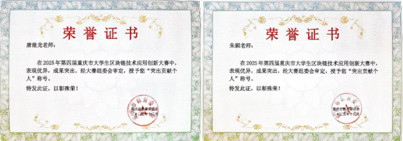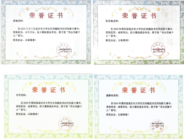 本次大赛汇集了来自全市21所学校的137支参赛队伍同场竞技,竞争激烈。重庆城市科技学院人工智能与大数据学院选派四支队伍参加区块链技术赛道。经过激烈角逐,其中三支队伍最终荣获一等奖、二等奖和三等奖各1项的成绩。相关指导教师也凭借扎实的专业素养与悉心指导,被授予“突出贡献个人”荣誉称号。