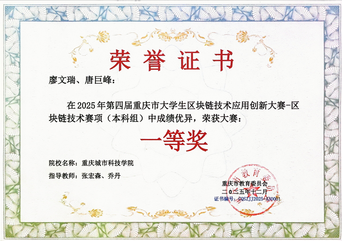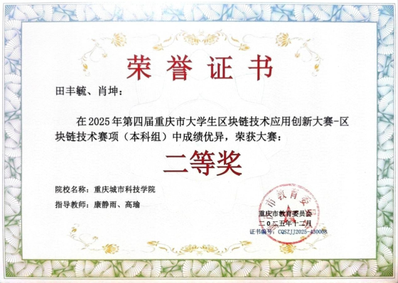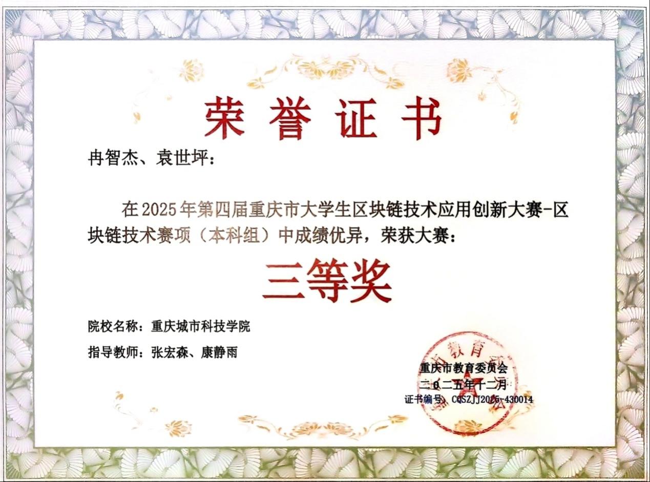 近日,由重庆市教育委员会主办、重庆城市科技学院和新E代数字智能信息技术产业学院承办的2025年第四届重庆市大学生区块链技术应用创新大赛获奖名单正式公布。