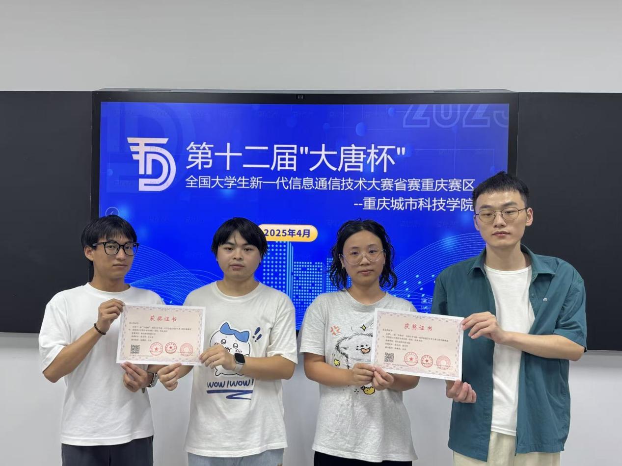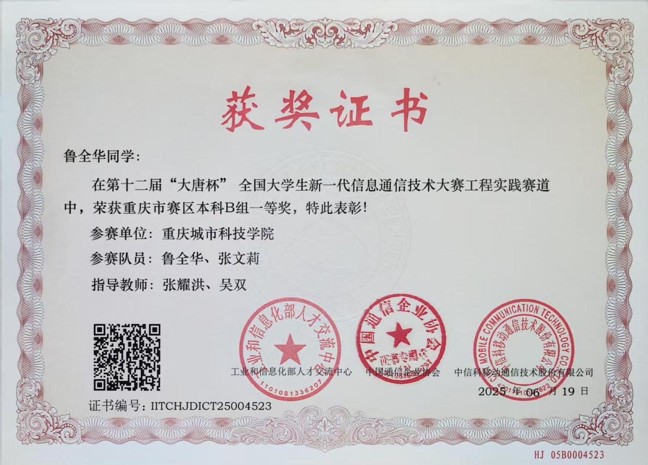 近日,由工业和信息化部人才交流中心、中国通信企业协会和中信科移动通信技术股份有限公司主办的第十二届“大唐杯”全国大学生新一代信息通信技术大赛圆满落幕。本届大赛吸引了全国数百所高校的数万名学生同台竞技,竞争激烈。其中,我校来自人工智能与大数据学院的鲁全华和张文莉同学在张耀洪、吴双两位老师的指导下凭借扎实的专业知识、出色的创新能力和稳定的临场发挥,一路过关斩将,最终荣获重庆市赛区本科B组一等奖,实现我校在该赛事中的首次突破,充分展现我校学子的卓越风采和人才培养的强大竞争力。