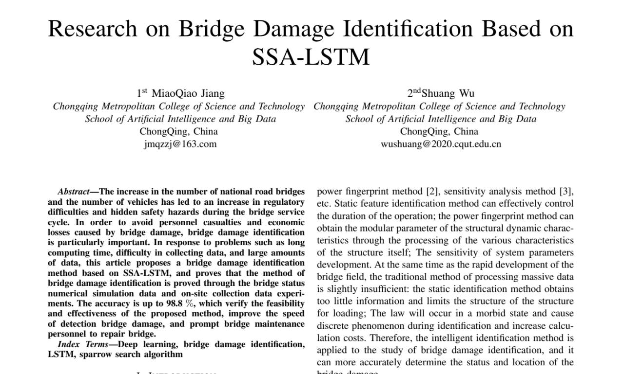本次大会共收到来自国内外学者的学术论文427篇,内容涵盖了人工智能领域内的热点话题和核心技术,经严格评审后正式录用164篇。我院姜妙乔老师与吴双老师的研究成果《Research on Bridge Damage Identification Based onSSA-LSTM》被该会议收录,论文提出了基于SSA-LSTM方法研究桥梁损伤识别问题。通过仿真模拟数据和乌江涪陵大桥现场采集数据证明了该方法的可行性,最终准确率高达98.8%。